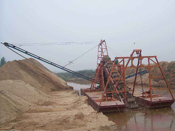 挖沙船,即采掘沙石、沙礦的機(jī)械設(shè)備工具,一般為電動(dòng)遷移式或柴油機(jī)械動(dòng)力式。船體采用拼裝式箱型結(jié)構(gòu)。配有挖掘裝置、篩選裝置、提升裝置、傳送裝置等。通過(guò)電機(jī)驅(qū)動(dòng)挖斗上料,石塊通過(guò)篩選傳由輸送帶傳出,沙子由輸送帶傳到指定地點(diǎn)。